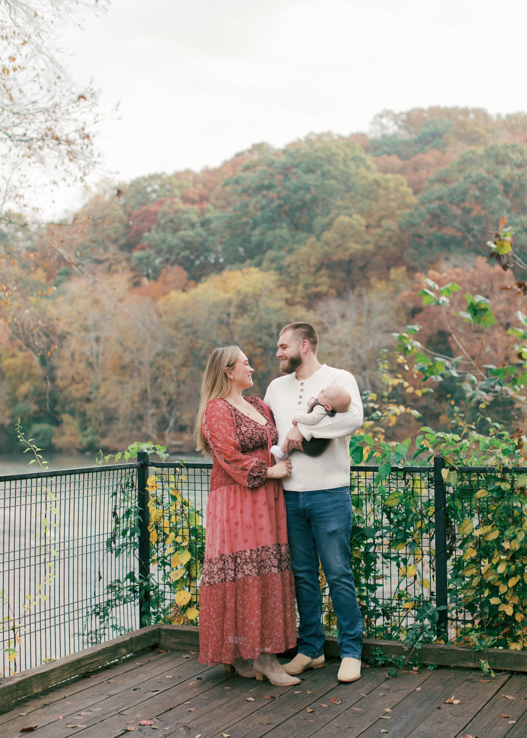 This morning was gloomy and foggy, but the fall colors were on full display for this family session by the river. The trees flashed bright pops of red through the mist, and even in the soft gray light, the whole scene felt rich, warm, and perfectly autumn for this sweet family.